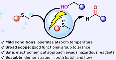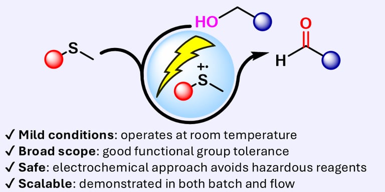 We report eCarbonyls, a scalable, metal-free electrochemical oxidation of alcohols that mimics key features of the classical Swern reaction while avoiding its reliance on cryogenic conditions and hazardous reagents.